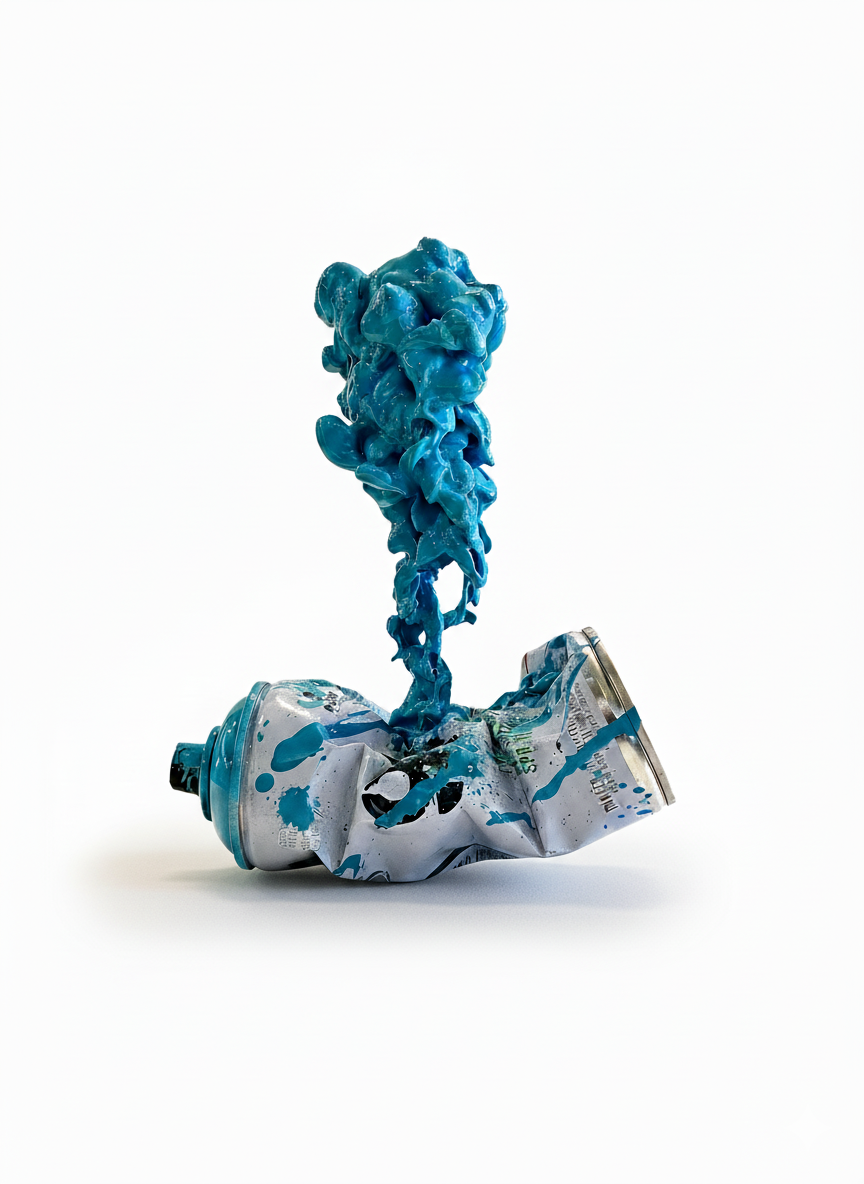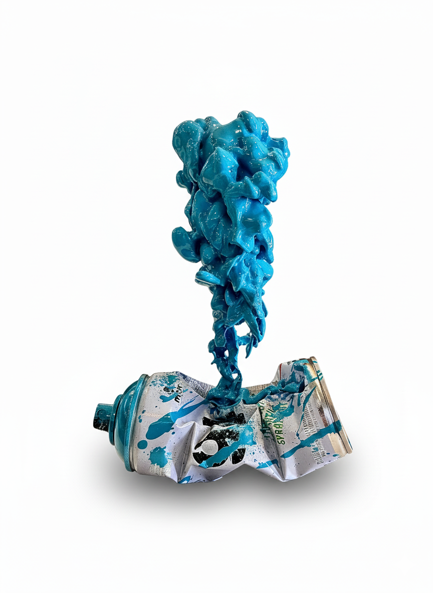 Sculpture d’une bombe de peinture compressée, saisie dans l’instant où la pression libère un jaillissement. Cette pièce met en valeur la puissance du jet, capturant l’énergie brute du geste urbain et la transformant en œuvre pérenne.