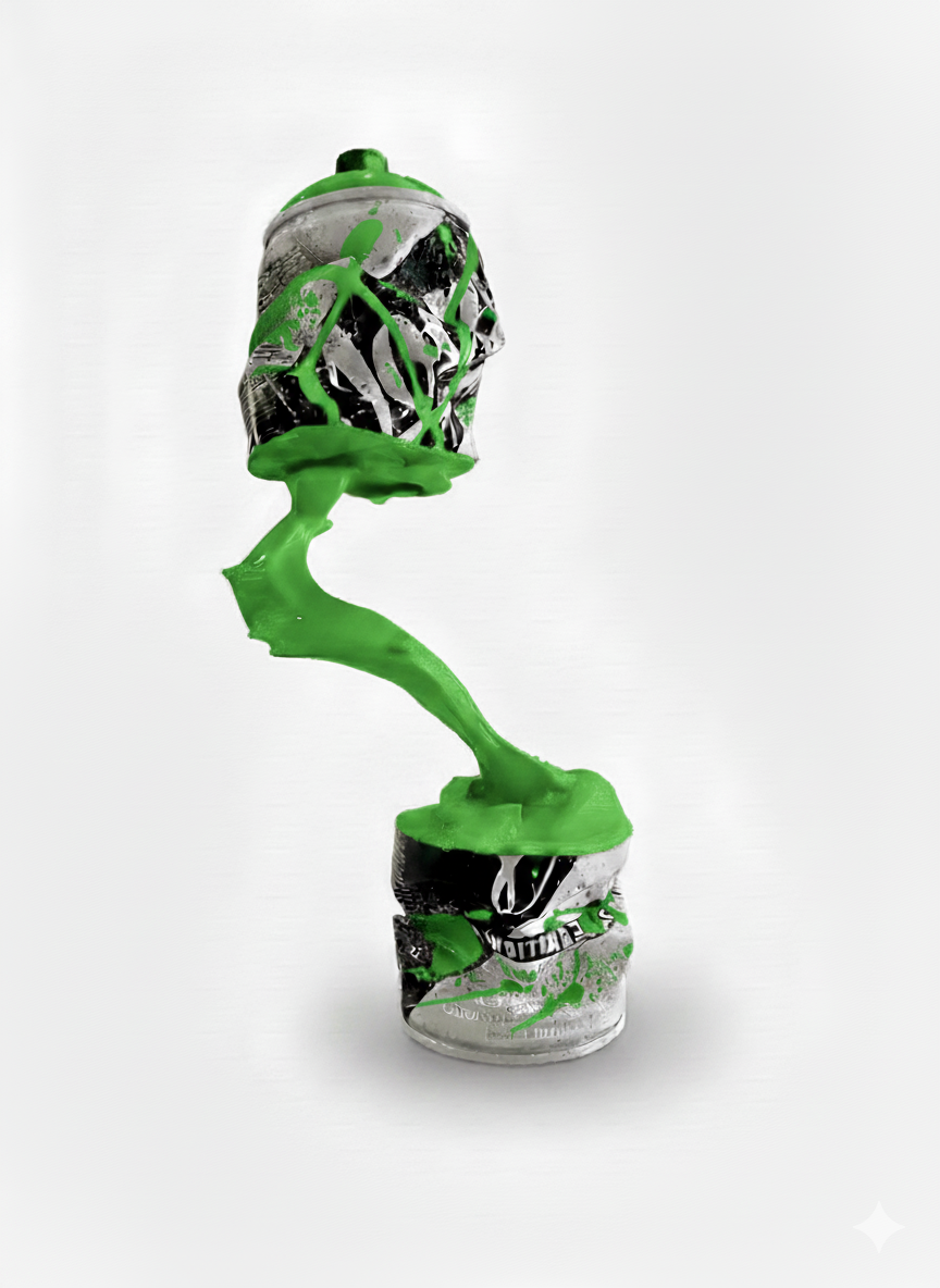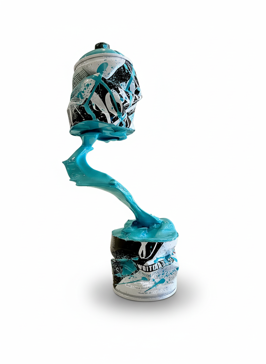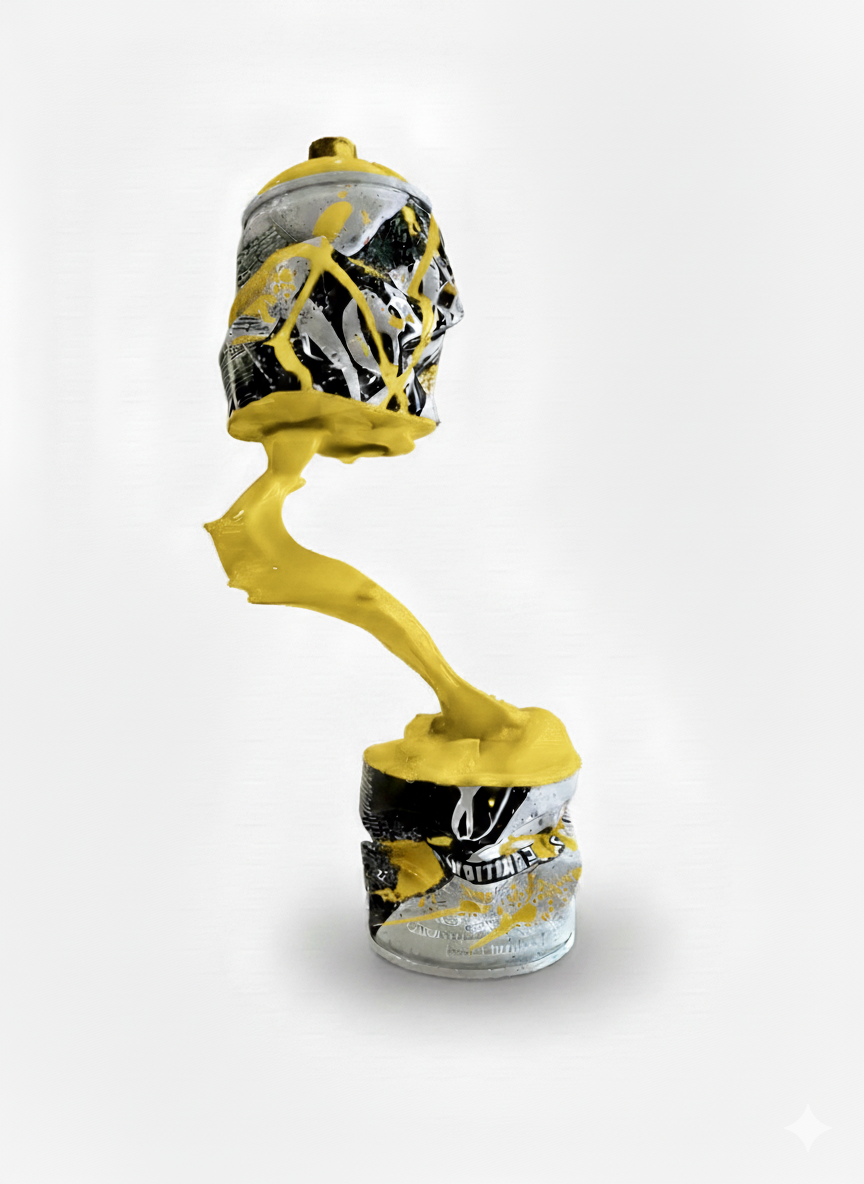 Sculpture d’une bombe de peinture compressée, traversée par un flux qui s’étire comme un trait de pinceau. Cette création souligne la continuité du geste, entre éclat spontané et précision, et fige la peinture dans une trace durable.